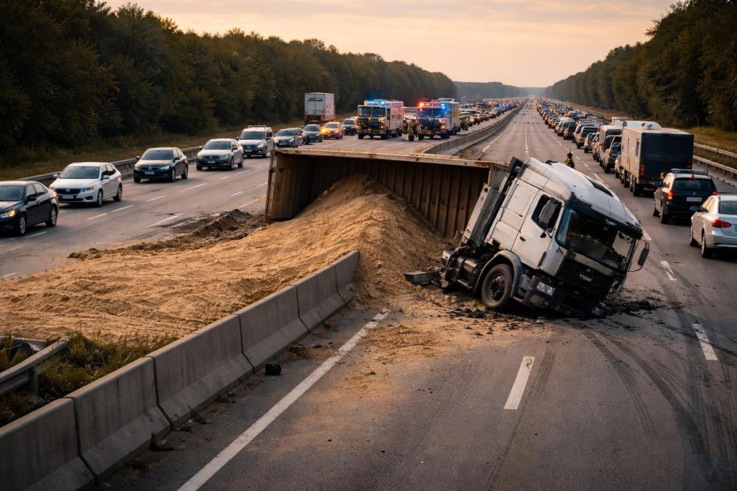 Pe Autostrada A1 București-Pitești, în apropierea localității Bolintin-Deal, județul Giurgiu, a avut loc în această după-amiază un accident major: un TIR încărcat cu nisip s-a răsturnat și a ajuns pe celălalt sens, blocând complet circulația. Potrivit Centrului Infotrafic, traficul este restricționat pe BENZILE 2 ale ambelor sensuri, iar desfășurarea se realizează cu dificultate pe BENZILE 1, ceea ce a dus la formarea de coloane în ambele sensuri.